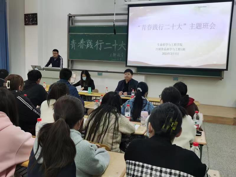 为深入学习宣传贯彻党的二十大精神,推动“时代新人铸魂工程”落地落实,3月7日下午,生命学院2021级食品科学与工程班召开了以“青春践行二十大”为主题的班会,学校副校长郑小平到会指导并为同学们讲授了“开学第一课”,会议由班主任李宏斌老师主持。