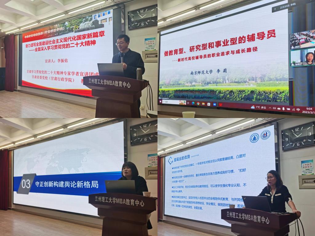 此次培训,学工部邀请了甘肃省学习贯彻党的二十大精神专家学者宣讲团成员、甘肃省委党校(甘肃行政学院)马克思主义学院院长李振佑教授,南京师范大学中北学院党委书记李莉,甘肃舆情数据研究中心主任王响响和材料科学与工程学院党委副书记王祎敏为辅导员开展专题讲座。培训会上,李振佑作了题为《奋力谱写全面建设社会主义现代化国家新篇章——全面深入学习贯彻党的二十大精神》专题讲座,深入阐释了党的二十大的重大现实意义和深远历史意义,重点围绕大会主題、过去五年的工作和新时代十年的伟大变革、开辟马克思主义中国化时代化新境界、新时代新征程中国共产党的历史使命、全面建设社会主义现代化国家的战略部署、深入推进新时代党的建设新的伟大工程和团结奋斗引领历史伟业七个方面全面系统解读了党的二十大精神。李莉以《做教育型、研究型和事业型的辅导员》为题,从“我们身处的时代、我们的职业使命、我们该怎么做”三个方面,聚焦立德树人的根本任务,阐述了新时代高校辅导员的职业追求与成长路径。王响响以《全媒体时代舆情风险防范与引导策略》为题做讲座,结合大量的案例分析,讲述了如何在高校做好舆情管理,构建舆论新格局。王祎敏以《材料科学与工程学院党团班一体化工作推进实践》为题,分享了学院推进党团班一体化建设做法和成效。