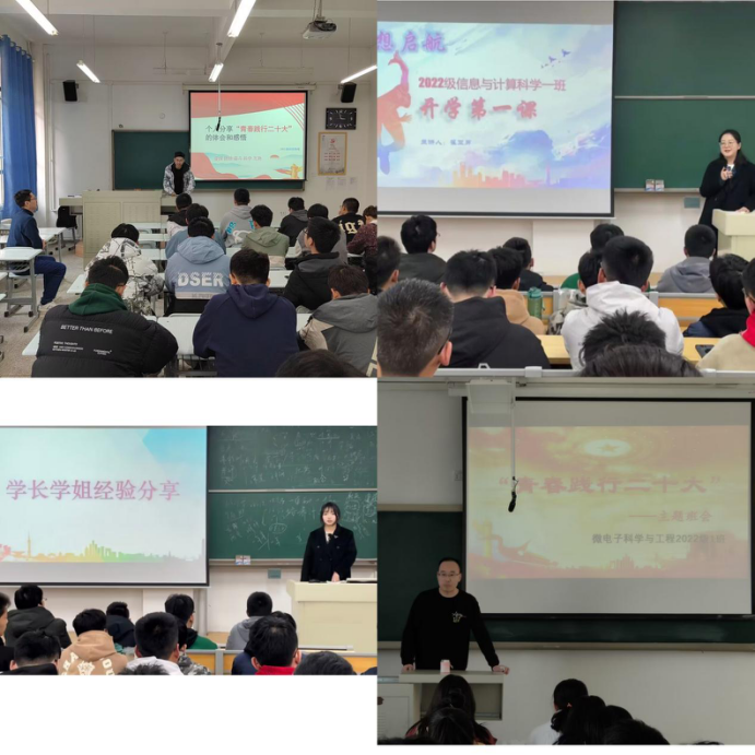 2月27日至3月12日,学院各班级紧紧围绕“爱国 团结 奋斗 科学 互助”五个关键词深入开展开学第一课主题班会。研究生各班级以安全教育为主题,开展了研究生安全教育大会进一步提升了研究生的安全意识,构建安全观念。本科生22级信息与计算科一班学班认真学习党的二十大精神,以“朋辈引领”为主题,邀请了本专业优秀的学长、学姐为大一新生从学习、生活、科研、各类竞赛等方面进行了详细的讲解,帮助他们尽快规划好大学生活,树立学习目标。21级应用物理一班开展学习二十大精神的心得体会交流,同学们纷纷表示要坚定不移听党话、跟党走,努力成长为堪当民族复兴重任的时代新人。19级应用物理一班以就业为主题,引导毕业生树立正确的就业观,认清就业形势,抓住就业黄金期尽快就业。