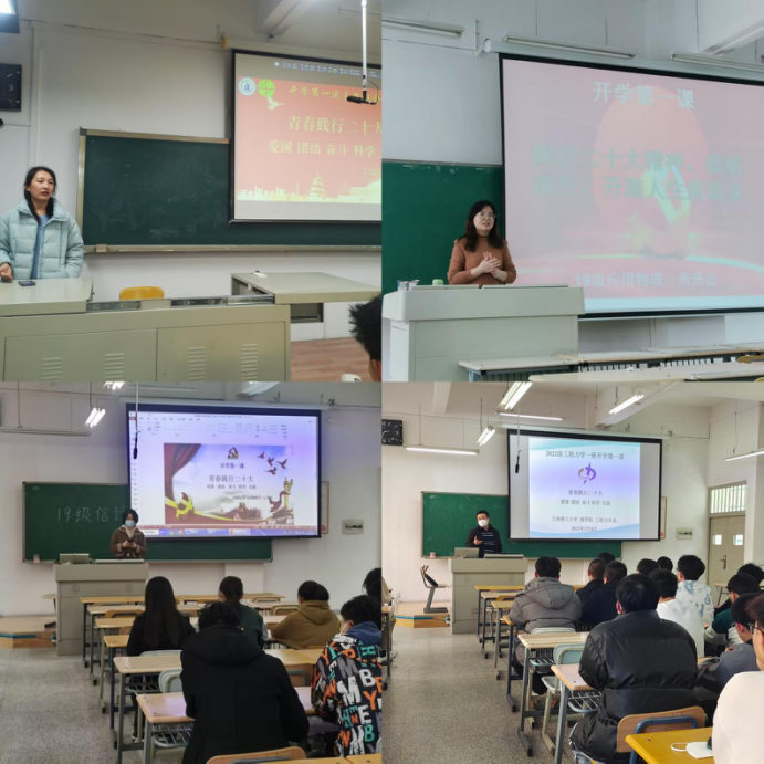 为深入学习宣传贯彻党的二十大精神,引导全体学生把思想和行动统一到党的二十大精神上来,以昂扬向上的精神面貌迎接新学期,理学院组织全院各班级开展以“青春践行二十大”主题的开学第一课系列活动。通过内容丰富、形式多样的教育活动,上好上活开学第一堂思政大课,激励广大同学坚定理想信念、涵养家国情怀、砥砺奋斗精神,以饱满的精神、奋进的姿态迈进新学期。