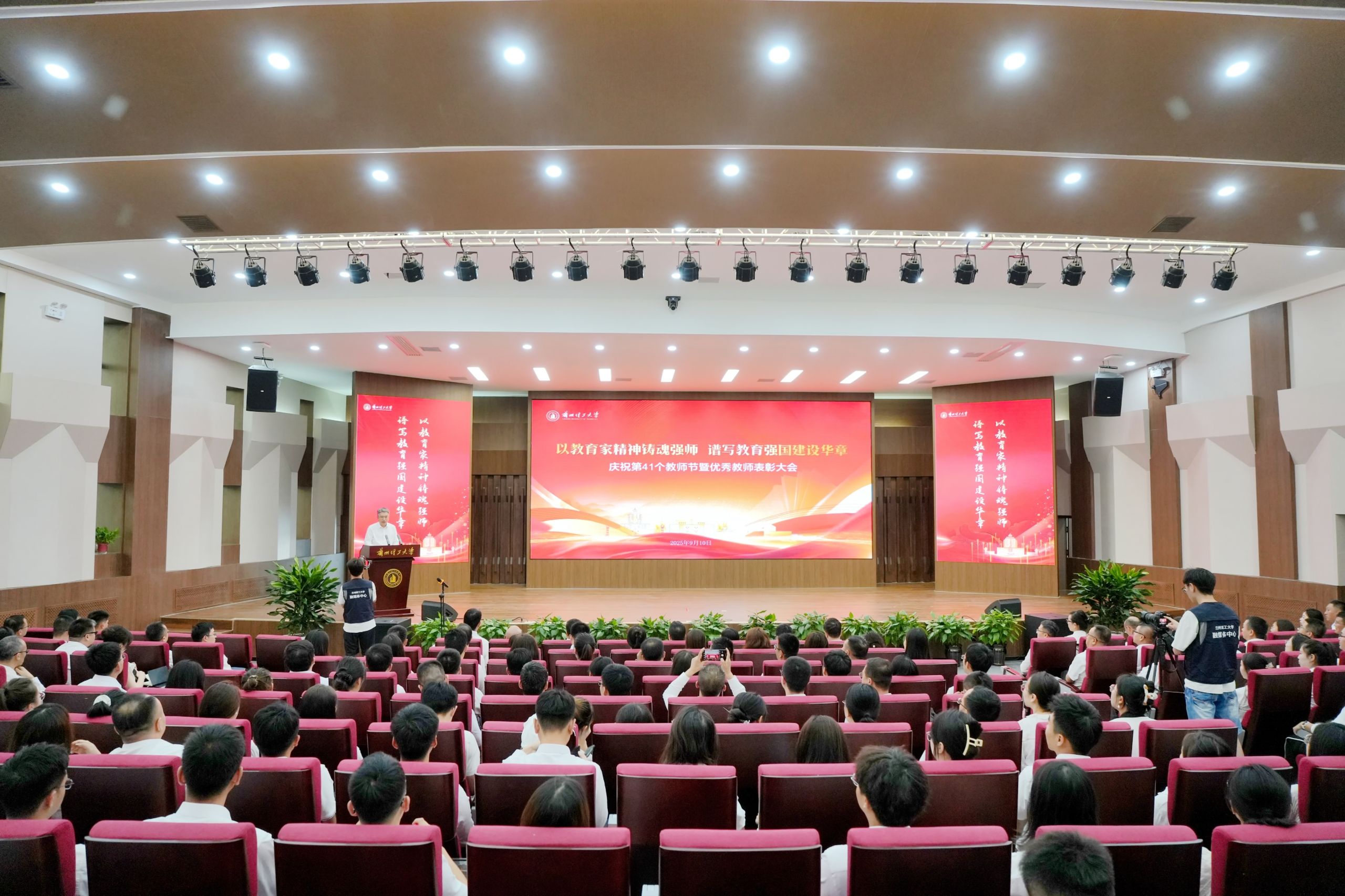 9月10日上午,第41个教师节到来之际,欧陆娱乐庆祝第41个教师节暨优秀教师表彰大会在兰工坪学术交流中心二楼报告厅隆重举行。大会以“以教育家精神铸魂强师,谱写教育强国建设华章”为主题,向全校教师致以节日的问候与祝福,表彰先进典型,凝聚育人力量。全体校领导出席庆祝大会,校属单位党政负责人、优秀教师代表、新入职教职工和学生代表共300余人参加大会。党委书记赵立香讲话,党委副书记、校长冀宏主持。